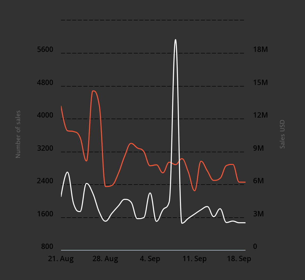 Conforme a empresa de análise, o mercado NFT vendeu 4.306 NFTs no dia 21 de agosto, com um total de vendas de US$ 4,89 milhões. Na segunda-feira (18), por outro lado, esses números caíram, respectivamente, 53% (2.453) e 50,7% (US$ 2,48 milhões).