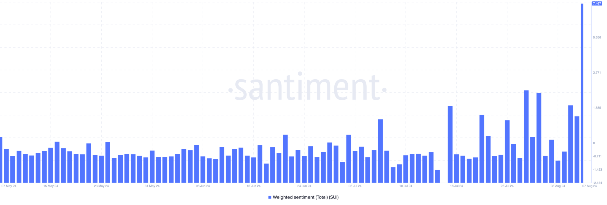 Antes do anúncio, o preço da SUI era de US$ 0,60. Momentos depois, houve um aumento nos comentários positivos on-line, levando o sentimento ponderado a atingir seu ponto mais alto no acumulado do ano.