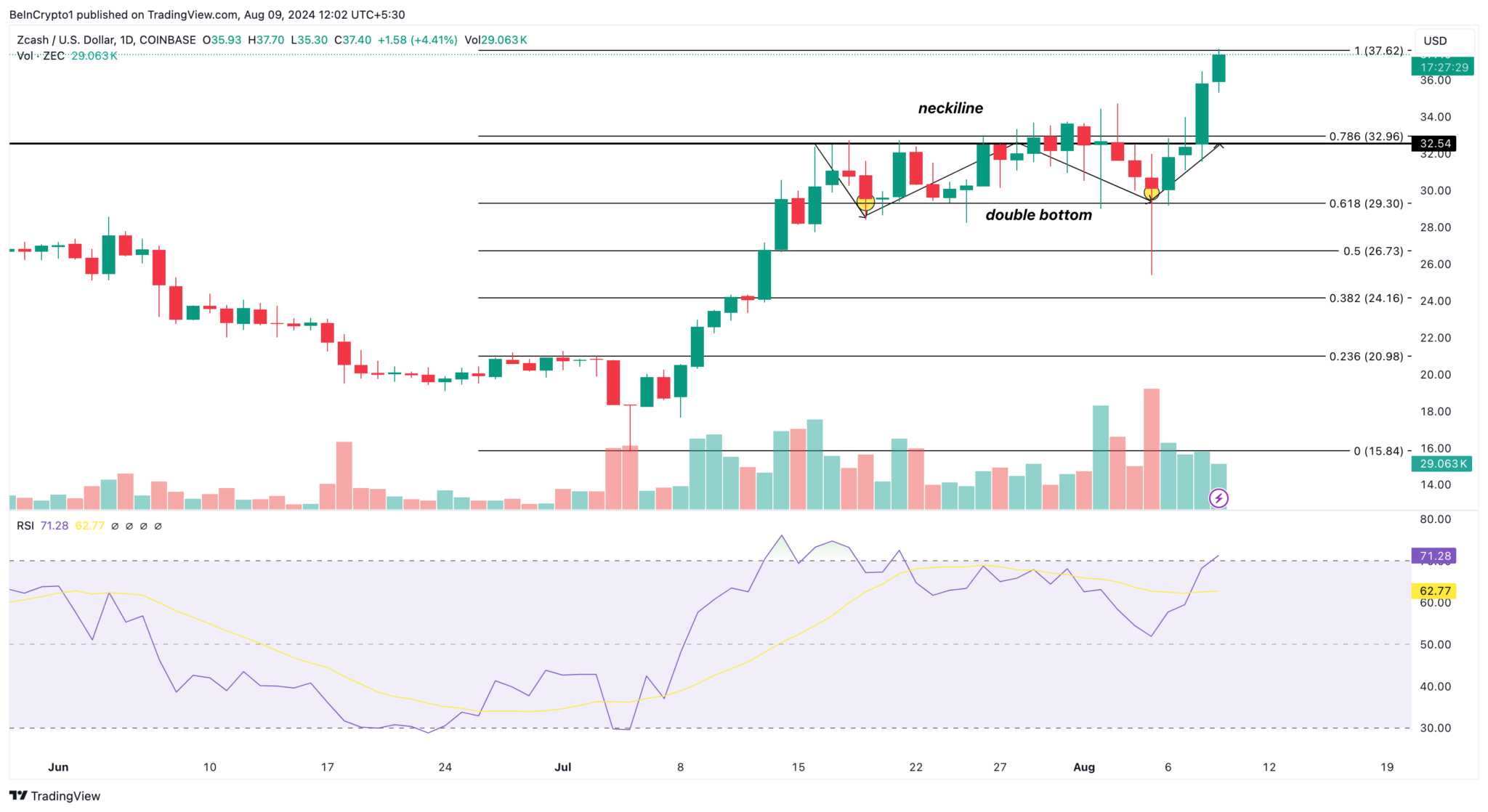 SponsoredComo mostrado abaixo, a ZEC confirmou a reversão altista rompendo a linha de pescoço em torno de US$ 32,54. Enquanto isso, o Índice de Força Relativa (RSI), que mede o momentum, indica que o token está sobrecomprado, com uma leitura de 71,28.