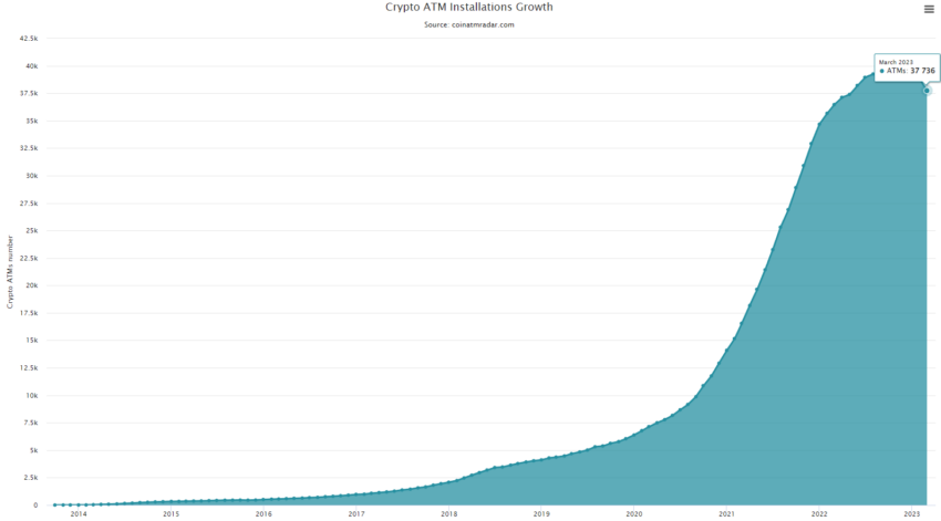 Naquela época, havia 25.305 caixas eletrônicos Bitcoin (BTC). Agora, por outro lado, apenas 37.736 continuam em operação em todo o mundo. De dezembro de 2022 a março de 2023, há 1.449 caixas eletrônicos a menos.