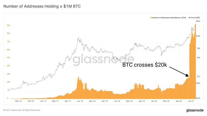 Mais de 94.000 endereços de Bitcoin (BTC) detêm pelo menos US$ 1 milhão em BTC, de acordo com uma análise da Glassnode. Provavelmente são novos investidores institucionais, mas continuem tímidos.