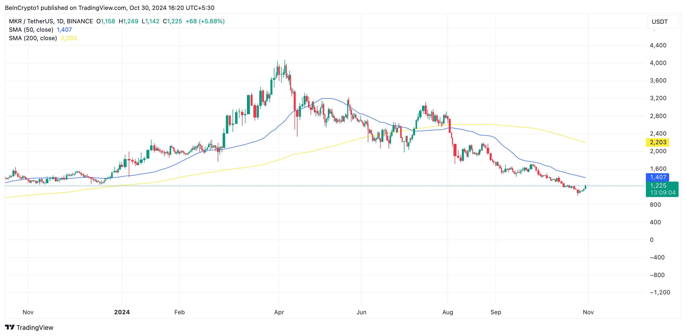 A MKR tem mantido uma tendência de queda desde julho, quando uma cruz da morte foi formada. Esse padrão ocorre quando a média móvel de curto prazo de um ativo (EMA de 50 dias) cruza abaixo de uma de longo prazo (EMA de 200 dias).