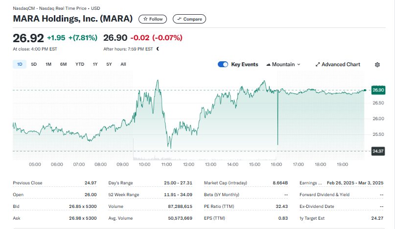 A abordagem agressiva da Marathon para aquisições de Bitcoin e seu planejamento financeiro foram bem recebidos pelo mercado. Suas ações fecharam quase 8% mais altas na quarta-feira, com ganhos no acumulado do ano de aproximadamente 14%, mostram dados no Yahoo Finance.