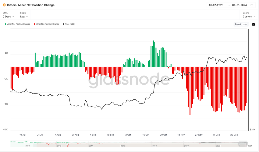 A tendência é observada em toda a indústria de mineração desde que o Bitcoin começou a crescer no último trimestre de 2023. A imagem abaixo mostra que a posição líquida dos mineiros tem diminuído continuamente desde o início de novembro.