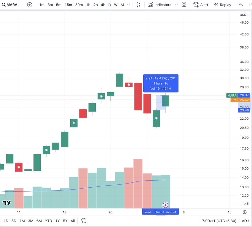 Na quinta-feira, o preço das ações da MARA fechou em US$ 26,88, uma alta de mais de 12% em relação ao fechamento de quarta-feira. No pré-mercado de sexta-feira (4), a ação era negociada a US$ 25,52 quando este artigo foi escrito.