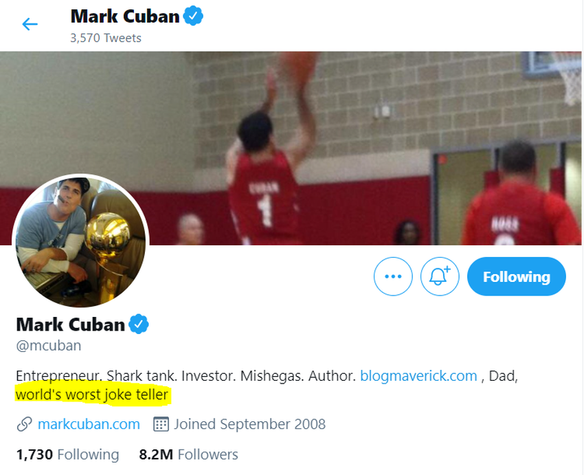 SponsoredEmbora Cuban tenha pedido um alvo de $ 1 para a DogeCoin, é difícil dizer se o bilionário está simplesmente cutucando a comunidade ou se ele realmente acredita que o projeto pode atingir $ 1. No entanto, seu perfil no Twitter o descreve como o “pior contador de piadas do mundo”.
