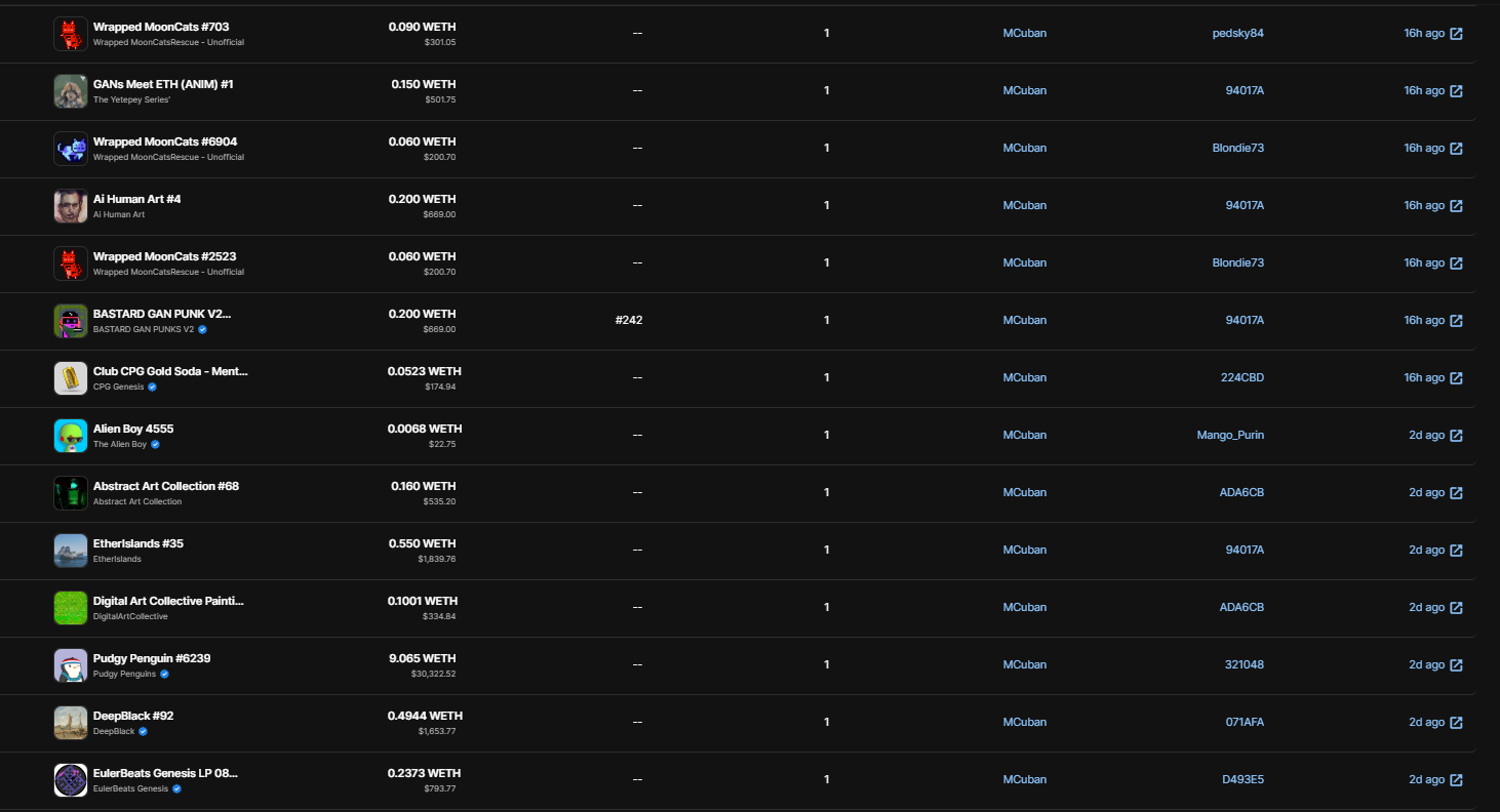 Em uma transação notável, Cuban vendeu seu Pudgy Penguins NFT # 6329 por 9,065 Ethereum (ETH), equivalente a quase US$ 30.000 no momento da venda. Além disso, o bilionário tentou vender um NFT com o tema Dallas Mavericks da série Proof of Culture por 15 ETH (aproximadamente US$ 50.194) por meio de uma de suas carteiras OpenSea.