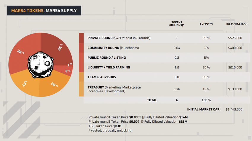 - Tokenomics duplo de um fornecimento fixo MARS4 tokens 4B para jogos, negociação e cunhagem de NFT e um fornecimento fixo de Mars NFTs (99.888 NFTs representando a superfície de Marte).