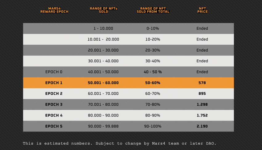 - Um total de 51% da receita de NFTs de terrenos é redistribuído aos proprietários anteriores de NFT, começando na Época 1 (TGE). A receita será redistribuída quando Mars4 atingir a próxima nova época.