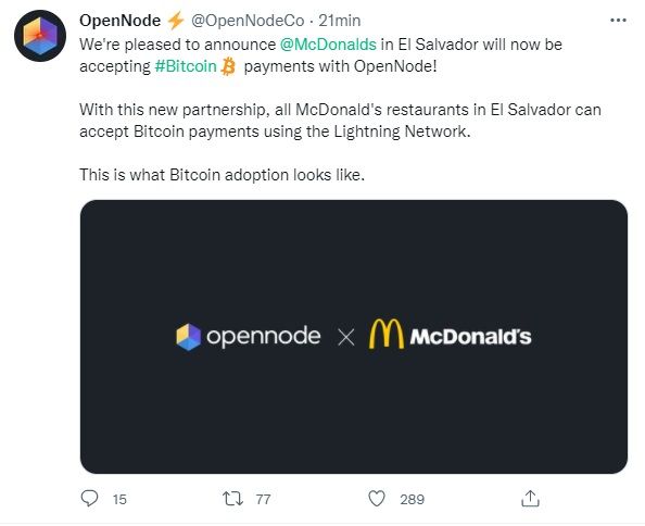 “Temos o prazer de anunciar que @McDonalds em El Salvador agora aceitará pagamentos de #Bitcoin com OpenNode!