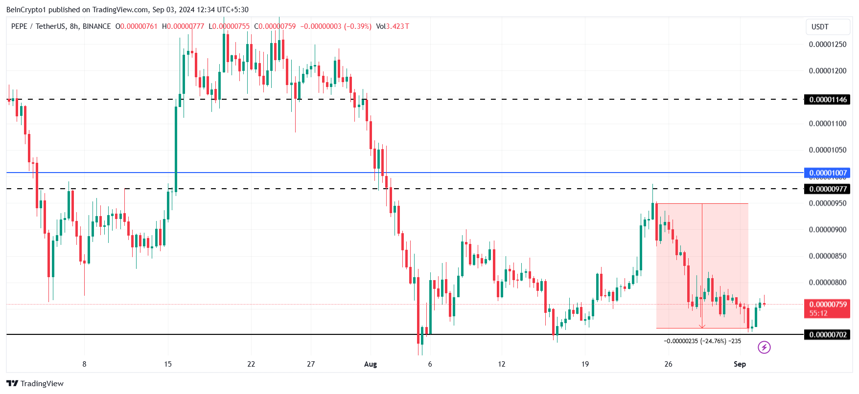Essa faixa está entre US$ 0.00000977 e US$ 0.00000702. Ambos os níveis foram testados no passado como resistência e suporte, respectivamente. O PEPE falhou em ultrapassar US$ 0.00000977 três vezes em meados de julho, enquanto quase caiu abaixo de US$ 0.00000702 três vezes em agosto.