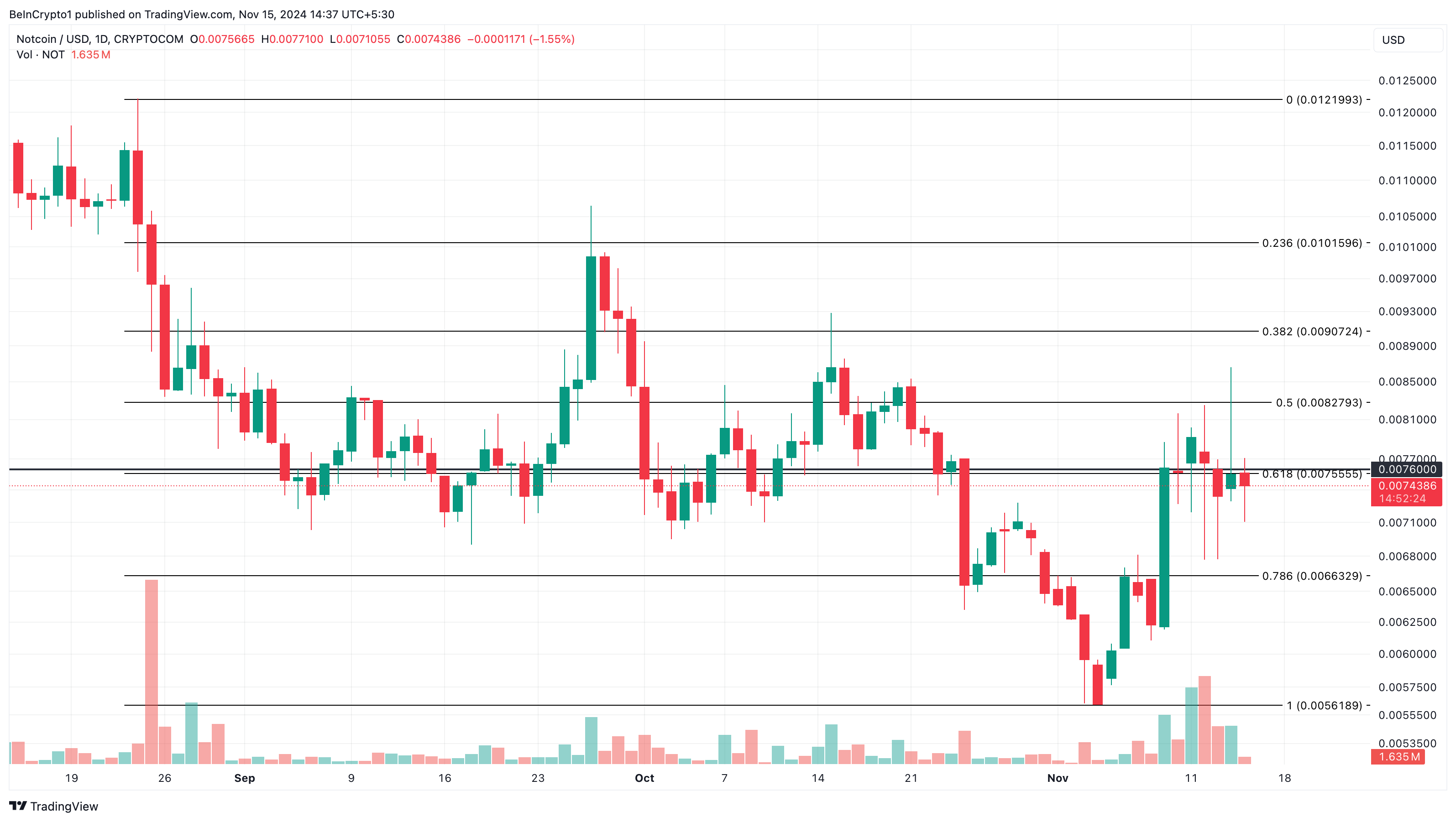 No gráfico diário, a NOT tentou subir em direção a US$ 0,010, mas a resistência em US$ 0,0076 impediu isso. O volume de negociação em torno do token baseado no Telegram também diminuiu, indicando uma queda no interesse do mercado.