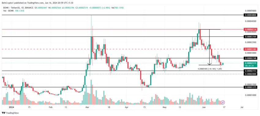 O preço da memecoins, negociado a US$ 0,00002519, já caiu mais de 40% no gráfico diário nas últimas duas semanas. A área entre US$ 0,00002748 e US$ 0,00002153 foi testada como consolidação no passado, o que a torna um forte suporte.