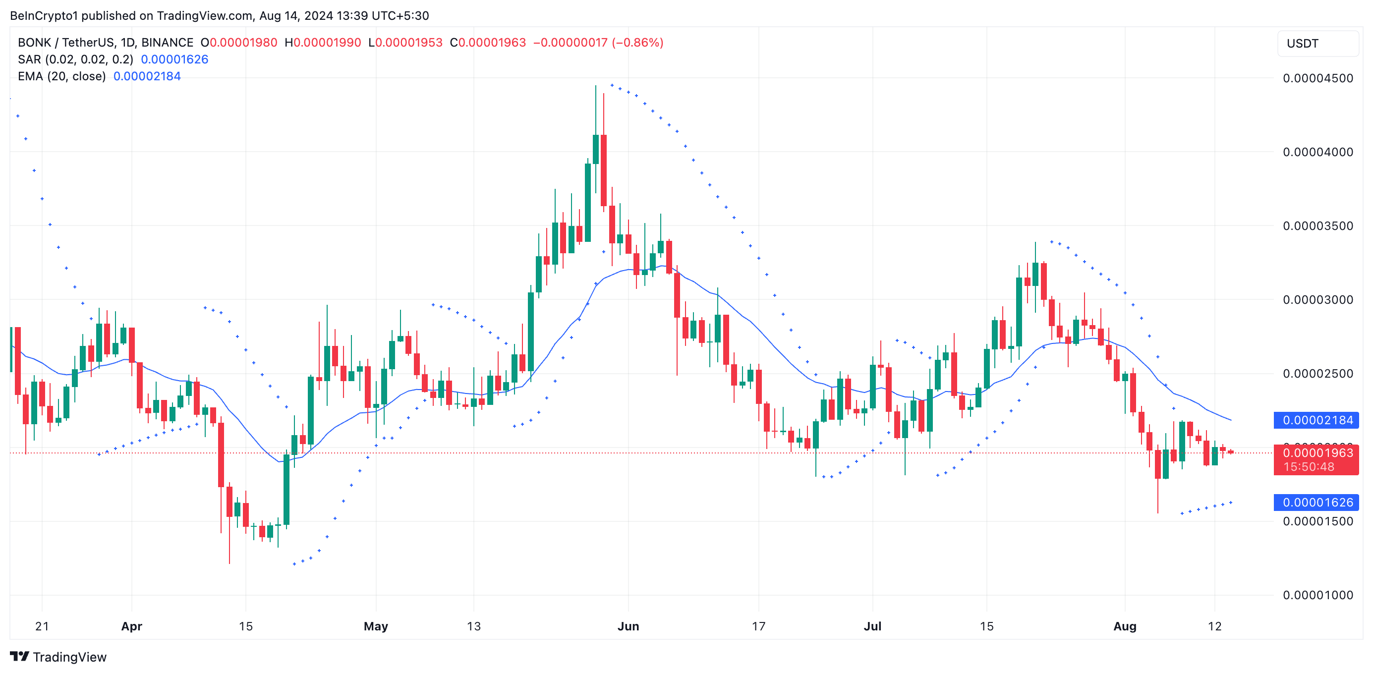 Além disso, os pontos que compõem o indicador Parabolic Stop and Reverse (SAR) do BONK estão abaixo do preço e têm sido posicionados dessa forma desde 8 de agosto.