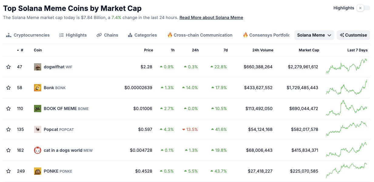 No relatório CoinMarketCap 2024 H1, as moedas meme foram rotuladas como a classe de ativos mais popular, representando uma participação de 22% do mercado. Nos últimos oito meses, o ecossistema Solana (SOL) liderou os gráficos, seguido por Ethereum (ETH) e tokens de inteligência artificial (IA).