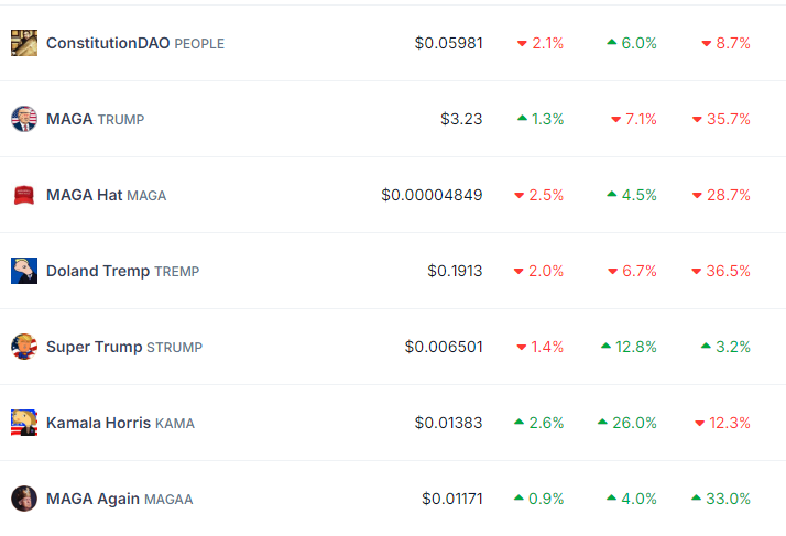 Mesmo assim, a moeda meme KAMA subiu quase 30%, sendo negociada por US$ 0,01387 no momento da redação. Os dados da CoinGecko mostram que ela é a maior ganhadora entre os tokens PolitiFi.