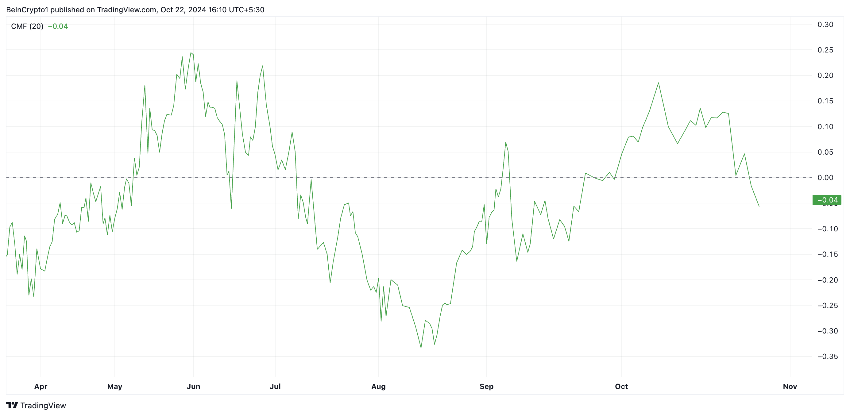 Quando seu valor está acima de zero, indica que um ativo está sendo acumulado, sugerindo um sentimento otimista, pois a pressão de compra supera a pressão de venda. Por outro lado, uma leitura do CMF abaixo de zero sugere um sentimento baixista. Isso sinaliza que a pressão de venda domina o mercado e que o momento de queda provavelmente continuará.