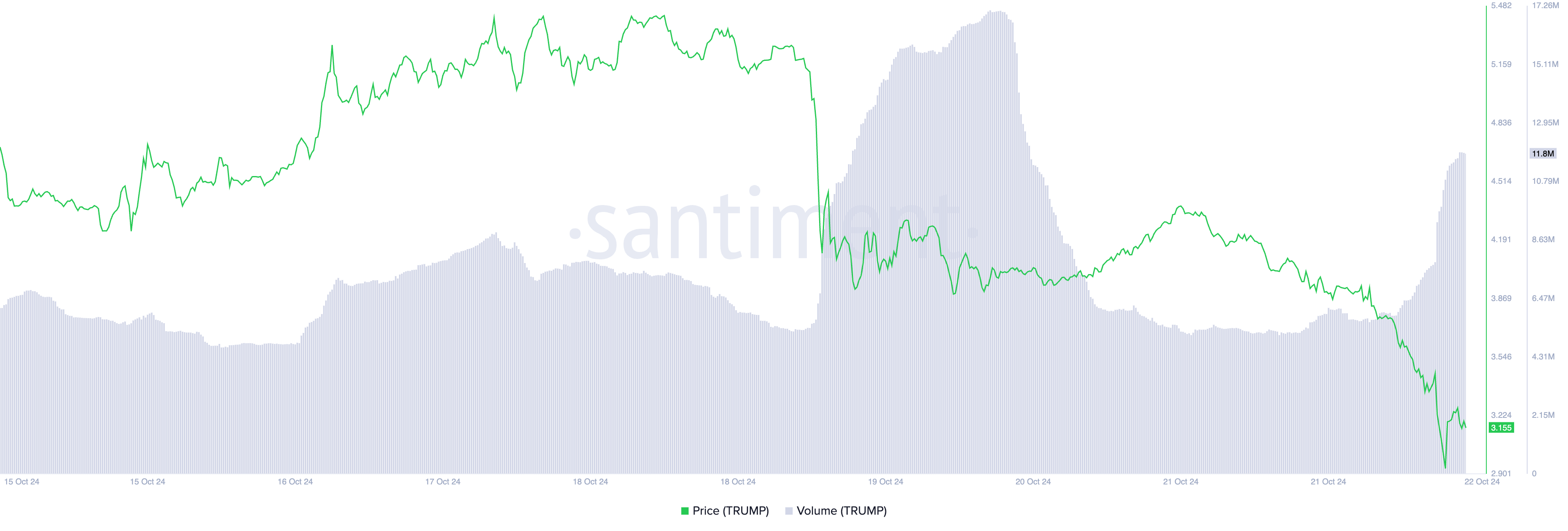O preço da TRUMP caiu 22% em apenas 24 horas. Durante o mesmo período, seu volume de negociação totalizou US$ 12 milhões, o que representa um salto de 122%.