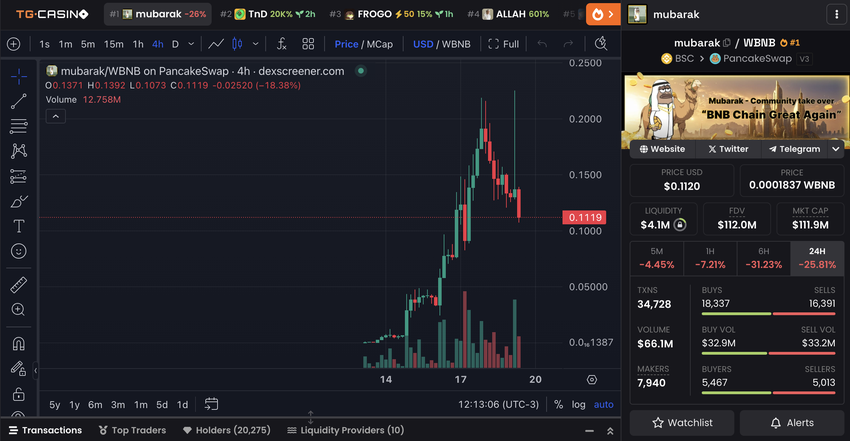 A Mubarak rapidamente se tornou uma das memecoins mais comentadas no ecossistema da BNB nos últimos dias. Ontem (19), sua capitalização de mercado chegou brevemente perto de US$ 200 milhões antes de recuar para cerca de US$ 112 milhões hoje (20).