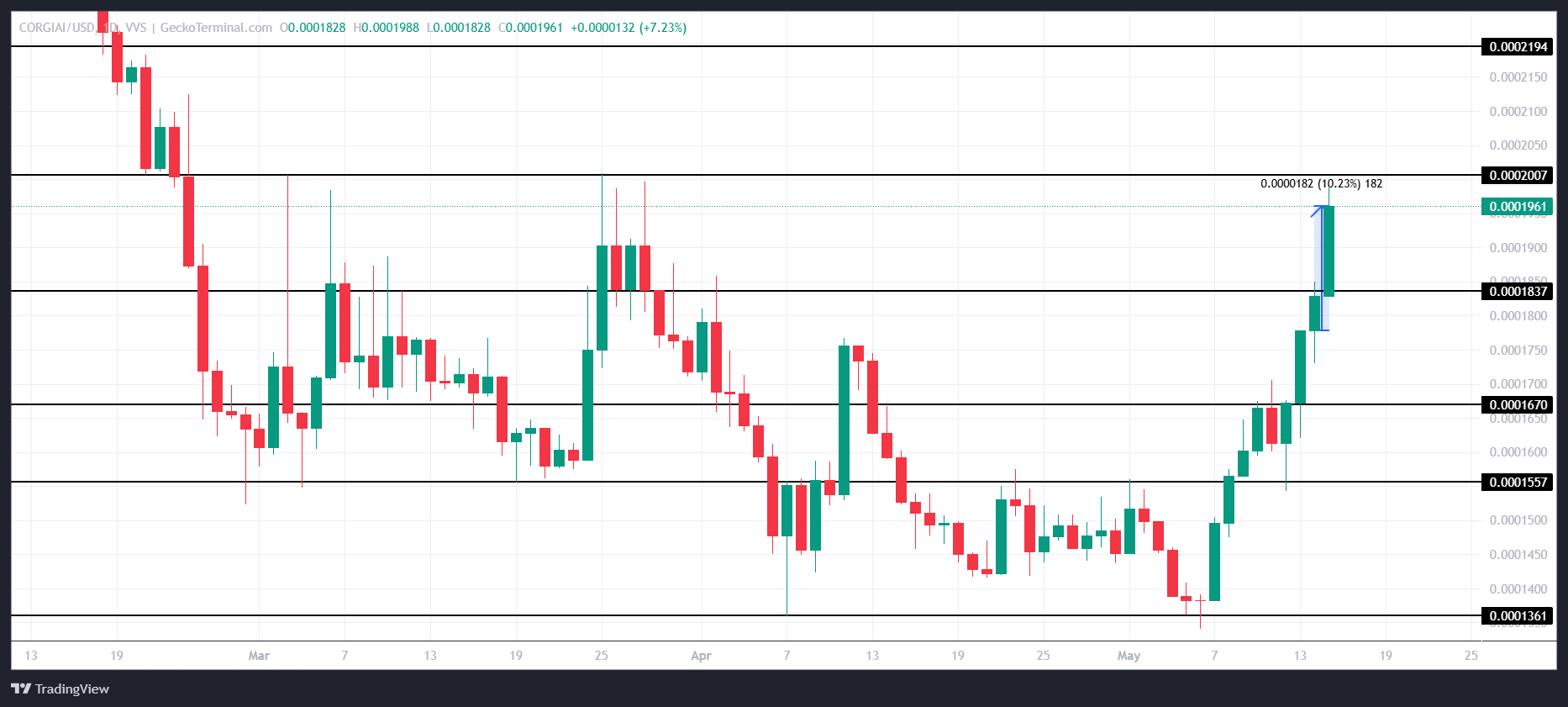 A moeda registrou uma alta de 10% nas últimas 24 horas, acompanhando o desempenho da Freysa AI. Atualmente, a memecoin é negociada a US$ 0,0001961 e enfrenta resistência em US$ 0,0002007. Caso consiga romper esse nível, pode haver um impulso de alta contínuo para a CORGIAI no curto prazo.