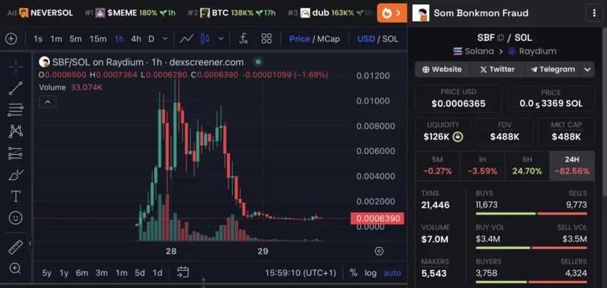 A FTX não foi a única memecoin a vivenciar essa jornada extraordinária após a decisão judicial de SBF. Outro projeto, desenvolvido na Solana, também surfou a onda e se beneficiou da condenação. Chamada de Som Bonkman Fraud, a memecoin viu seu valor disparar 18.000% e depois despencar 98%.