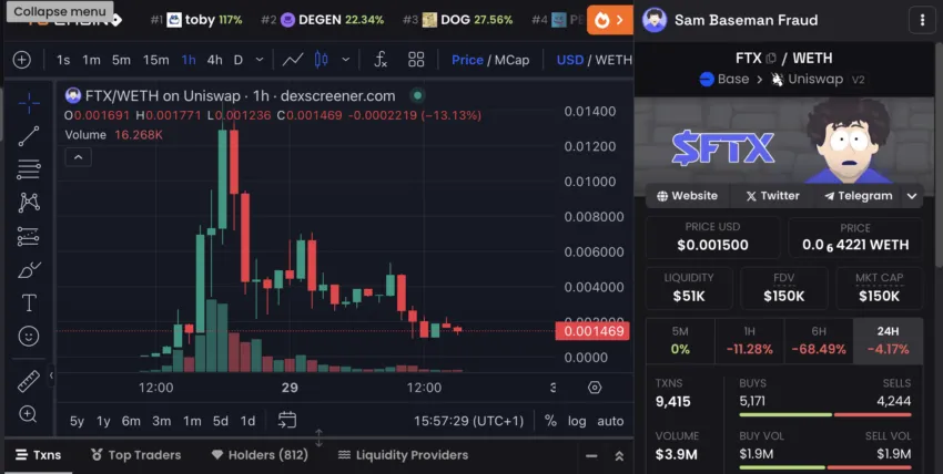 A Sam Baseman Fraud (FTX), memecoin que foi desenvolvida na Base, L2 da Coinbase, não esperou mais de duas horas para experimentar o desempenho massivo. De acordo com dados coletados pelo agregador Dexscreener, o valor da memecoin FTX aumentou quase 23.000%.