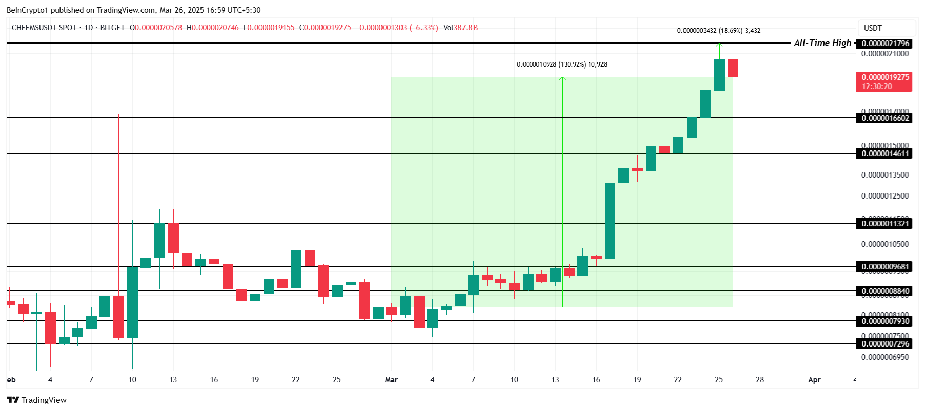 A CHEEMS surgiu como uma das memecoins de melhor desempenho este mês, subindo 130% desde o início de março. Atualmente negociada a US$ 0,000001927, a altcoin também registrou um novo recorde histórico (ATH) de US$ 0,000002179.