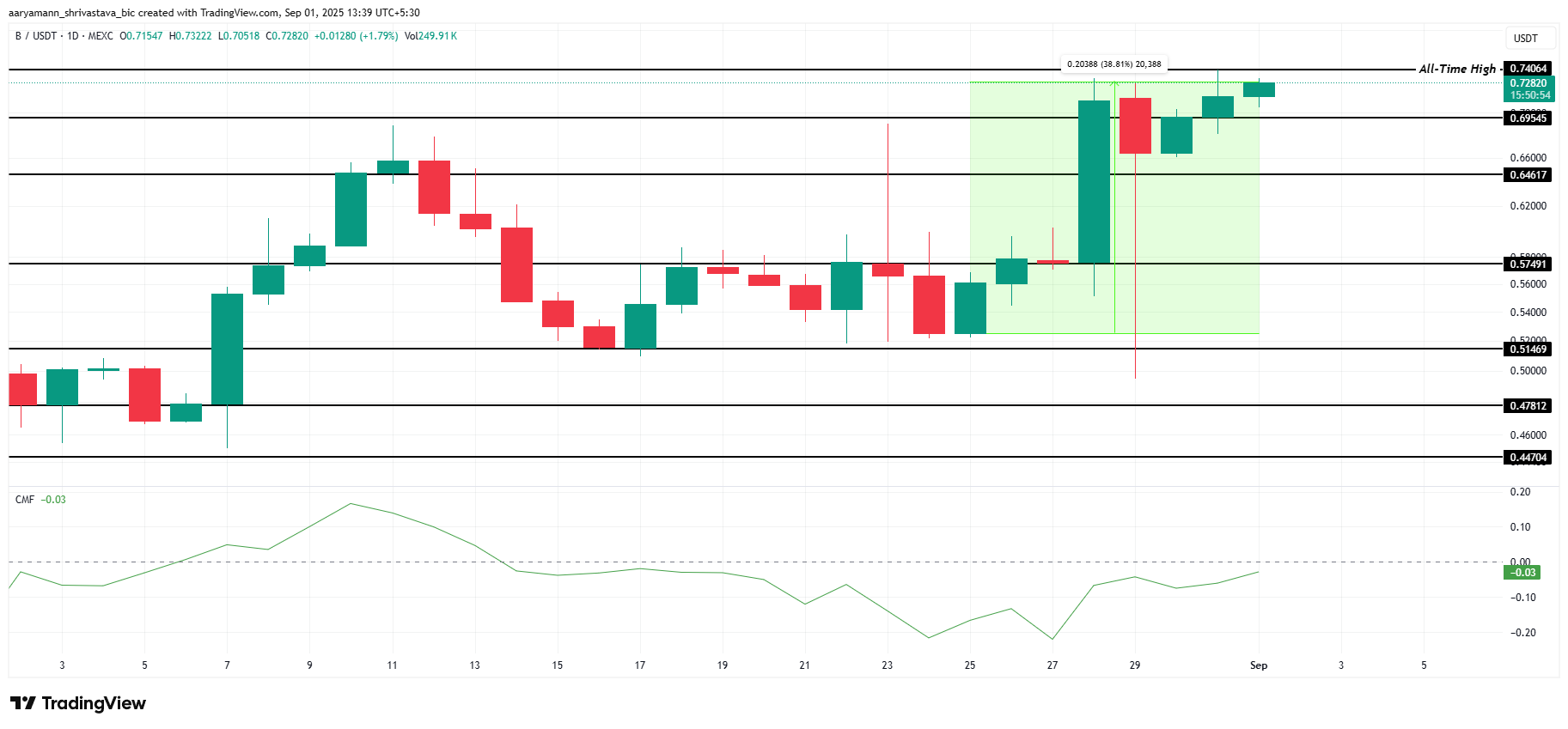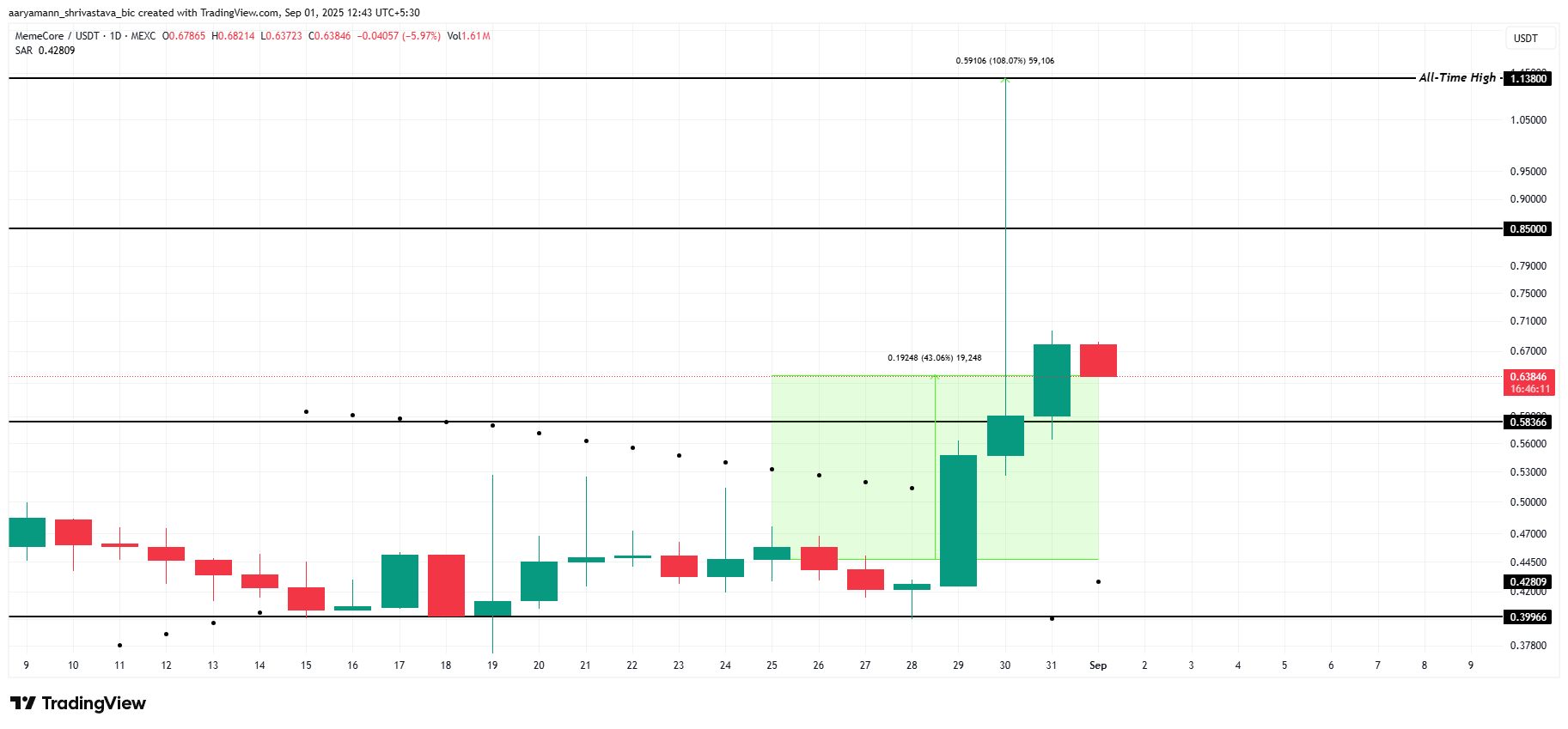 O preço da M subiu 43% nas últimas 24 horas, com a memecoin sendo negociada a US$ 0,638. Durante essa alta, a altcoin ganhou mais de 108% no total e atingiu um novo recorde histórico. O forte impulso atraiu atenção significativa à medida que a M consolida ganhos após um movimento ascendente rápido.