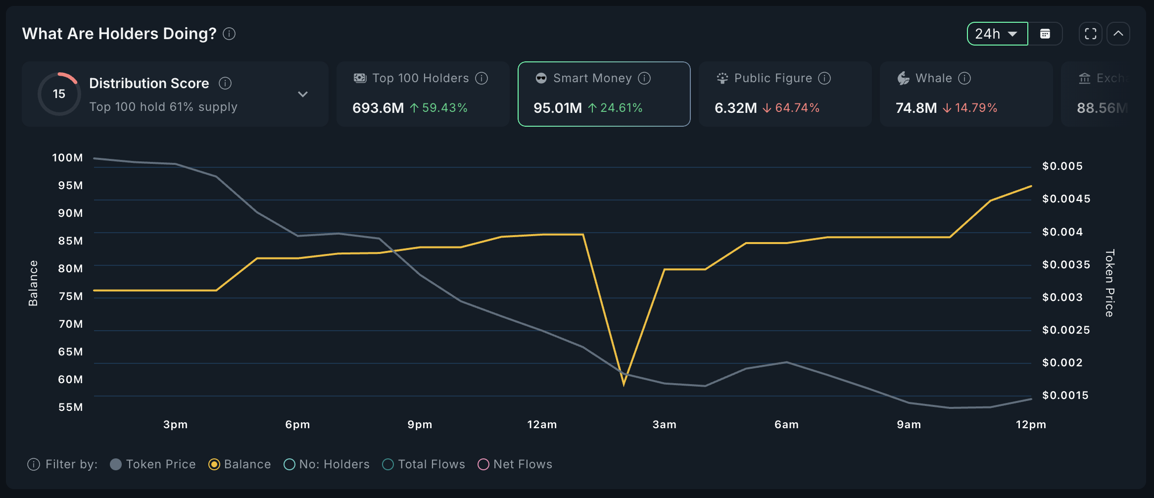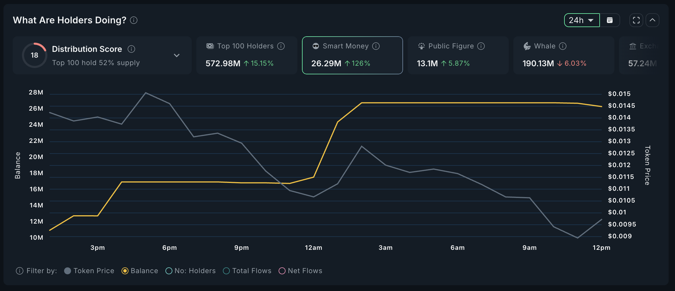 A acumulação de “Smart Money” aumentou 126% no mesmo período, subindo de 10,96 milhões para 26,7 milhões de tokens. O número de Top 100 detentores e Figuras Públicas também aumentou, sinalizando crescente confiança entre os principais participantes.