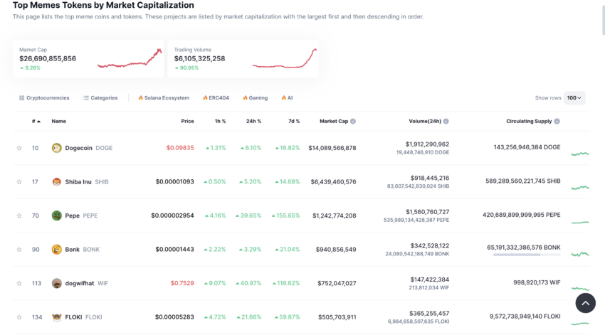 SponsoredA capitalização de mercado das moedas meme aumentou 9,26% nas últimas 24 horas, atingindo US$ 26,6 bilhões. PEPE e Dogwifhat (WIF) lideram esse crescimento, com saltos de 39,65% e 40,97%, respectivamente. Estes ganhos substanciais realçam a natureza lucrativa, mas volátil, do setor.