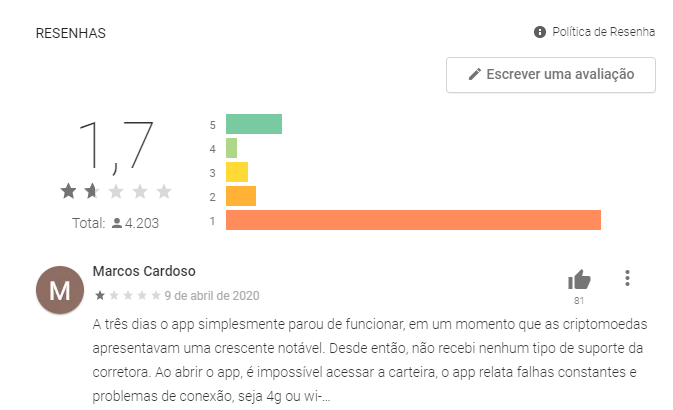 O aplicativo da corretora Mercado Bitcoin passa por uma brusca queda nas avaliações de usuários na Google Play Store.Segundo dados dos monitores de apps Android Rank e AppBot, o app passou de uma nota média na loja do Android de 3,5 no final da primeira semana de abril para 1,7 na manhã desta segunda-feira (13).