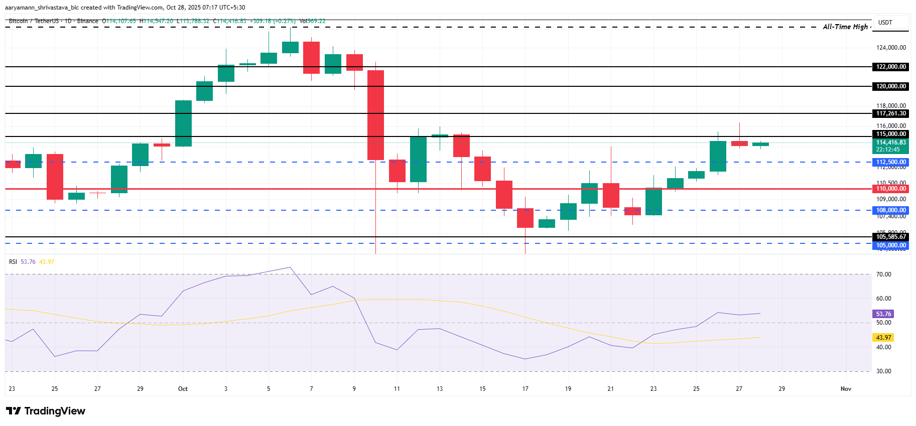 O preço do Bitcoin tem se mantido logo abaixo da resistência de US$ 115 mil nas últimas 24 horas, mostrando um impulso de alta limitado. Atualmente negociado na casa dos US$ 114 mil, a maior criptomoeda do mercado está lutando para romper essa barreira psicológica fundamental.