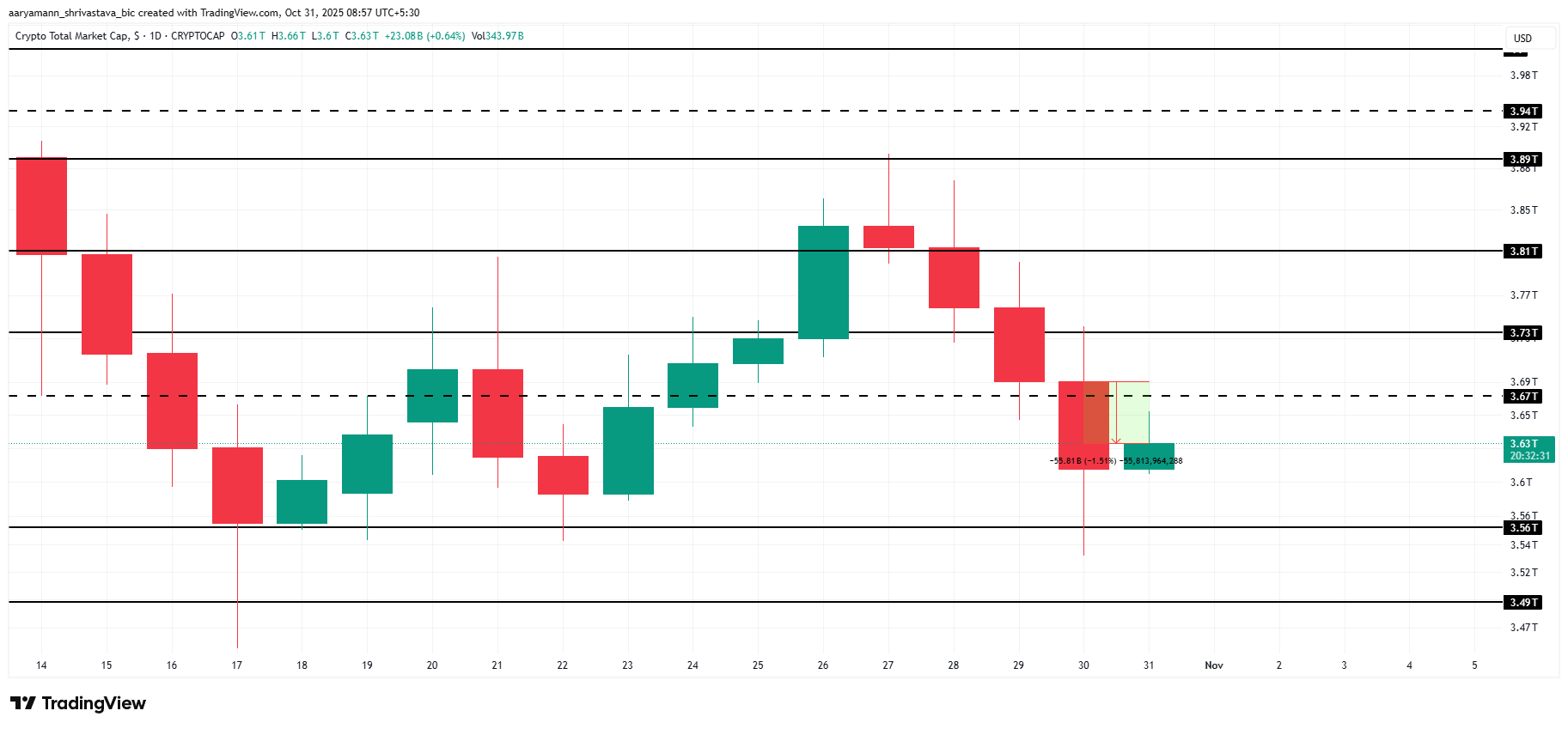 As condições macroeconômicas mais amplas sinalizam um movimento de baixa, o que pode aumentar ainda mais o risco de queda do mercado. Se a pressão vendedora se intensificar, o valor total poderá cair para cerca de US$ 3,56 trilhões.