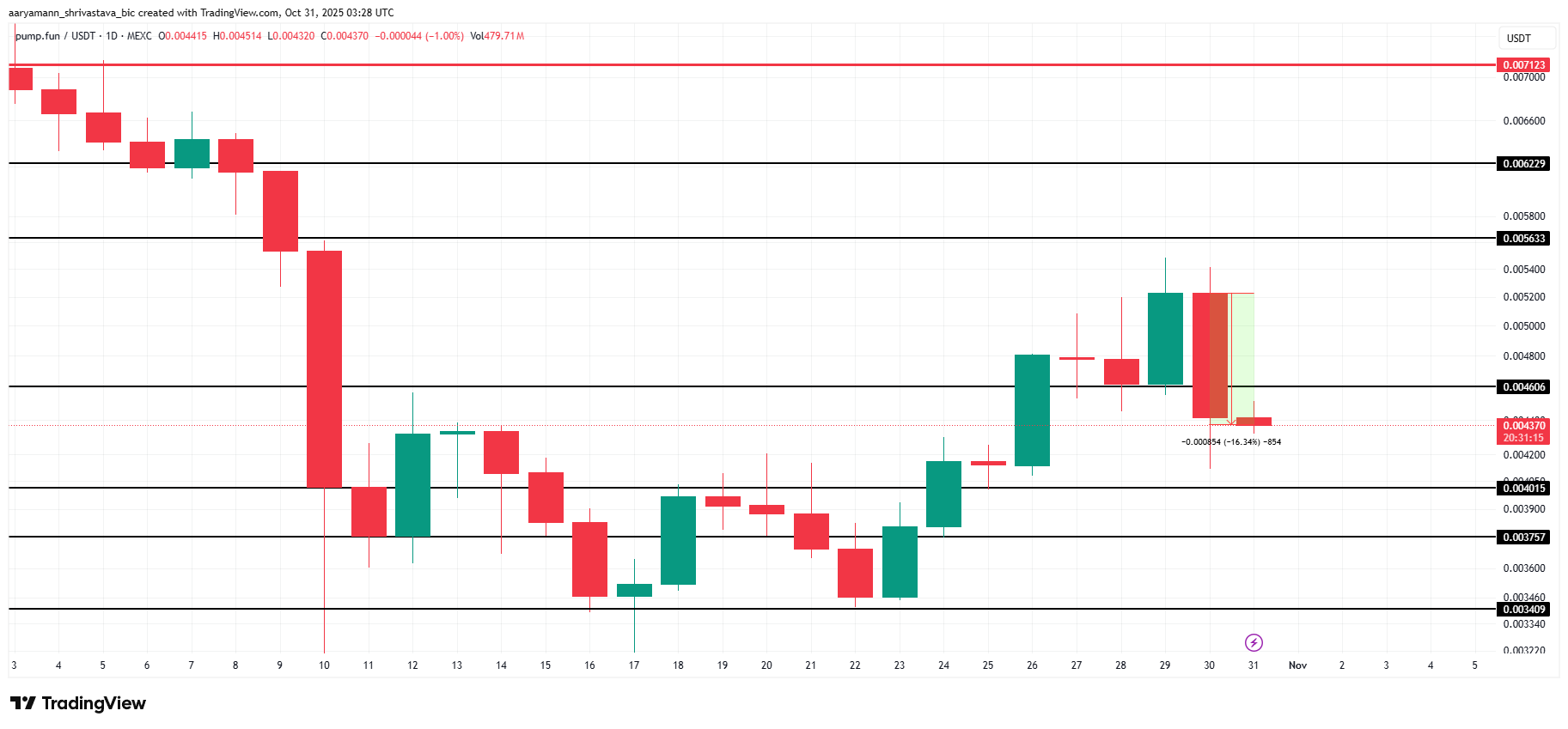 A altcoin caiu abaixo do nível de suporte de US$ 0,0046, expondo-a a um risco maior de desvalorização. Uma queda contínua poderia levar a PUMP a US$ 0,0040 ou menos, eliminando uma parte significativa de seus ganhos recentes.