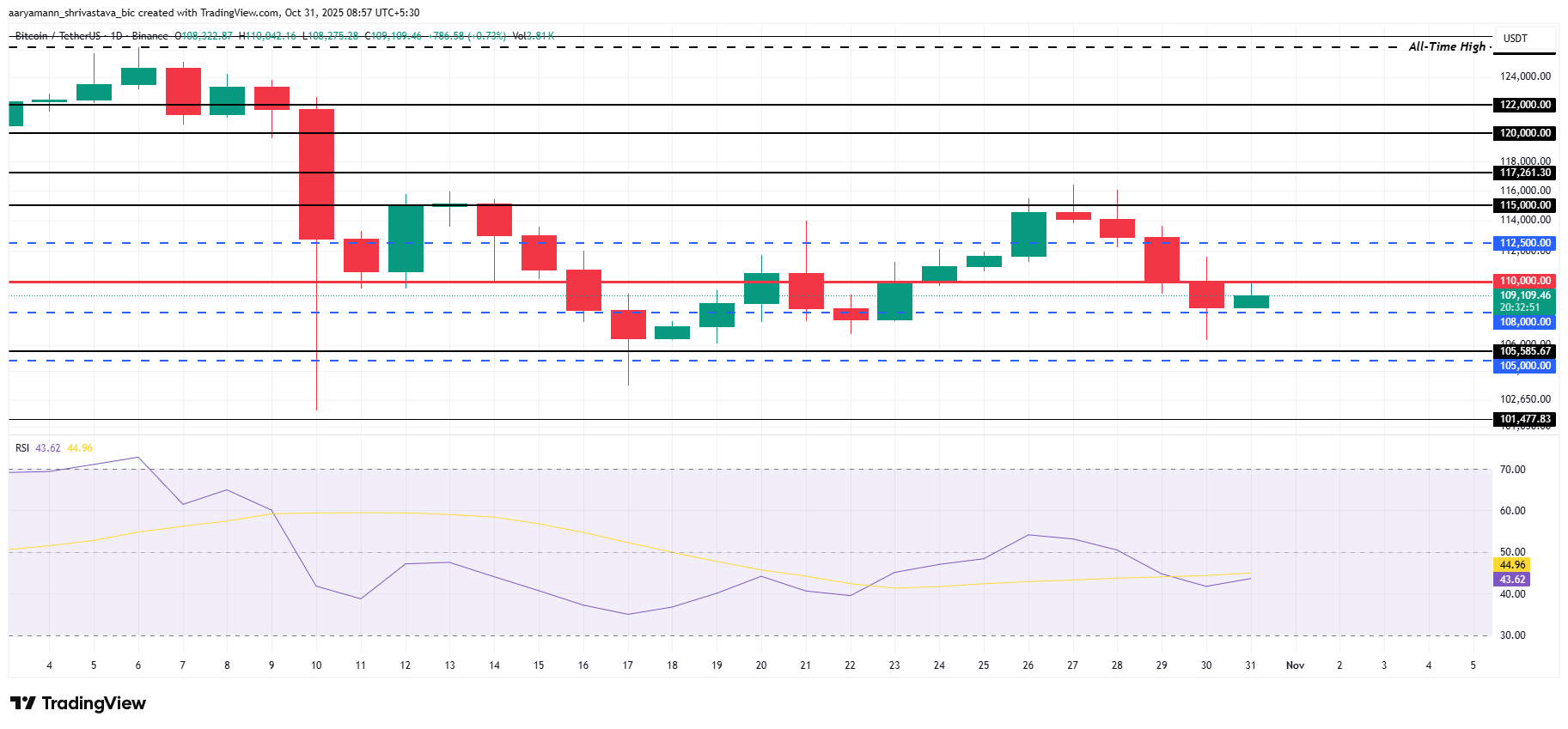 O Bitcoin está sendo negociado atualmente a US$ 109.109, mantendo-se logo acima do nível de suporte crítico de US$ 108 mil, após ter caído abaixo de US$ 110 mil nas últimas 24 horas. A perspectiva de curto prazo para a criptomoeda permanece cautelosa, enquanto os investidores aguardam uma pressão compradora mais forte.