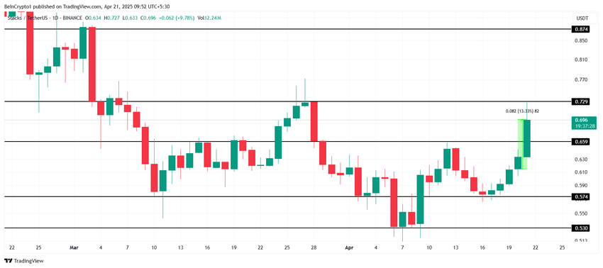 O preço da STX subiu 13% nas últimas 24 horas, sendo negociada a US$ 0,696. Esse aumento reflete o impulso de alta do mercado em geral. Se a tendência ascendente continuar, a altcoin pode garantir ganhos adicionais, com o preço subindo mais caso a resistência atual seja rompida.