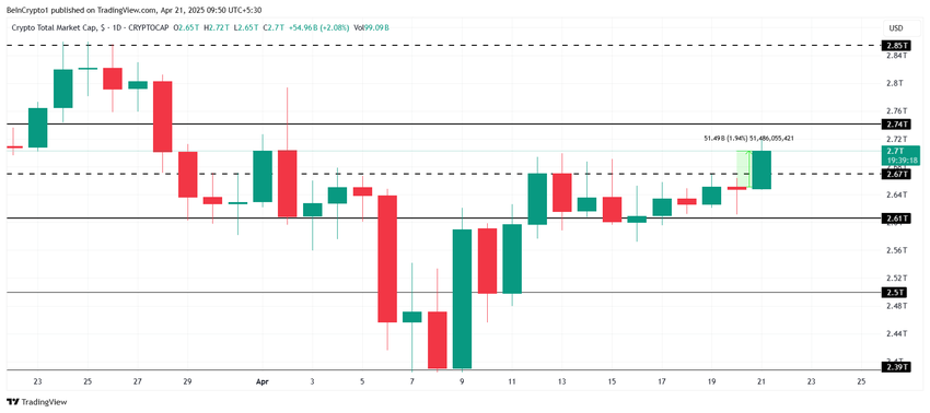 O TOTAL aumentou em US$ 51 bilhões nas últimas 24 horas, atingindo agora US$ 2,70 trilhões. O mercado de altcoins está prestes a ultrapassar a resistência de US$ 2,74 trilhões. Uma quebra bem-sucedida acima desse nível poderia impulsionar o TOTAL para US$ 2,85 trilhões, gerando ainda mais momentum de alta no mercado mais amplo.