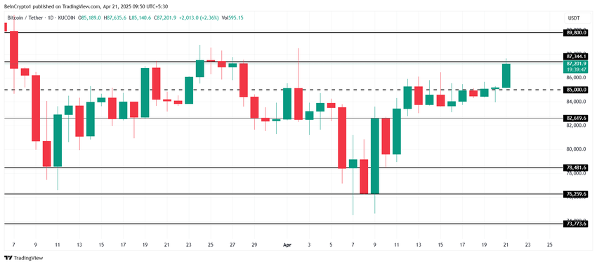 O preço do Bitcoin está se aproximando da resistência de US$ 87.344, sendo negociado a US$ 87.201 no momento da redação. A recente recuperação dos US$ 85 mil como suporte gerou otimismo, com o BTC parecendo prestes a romper sua resistência de várias semanas. Um rompimento bem-sucedido pode sinalizar um maior impulso de alta para a criptomoeda.