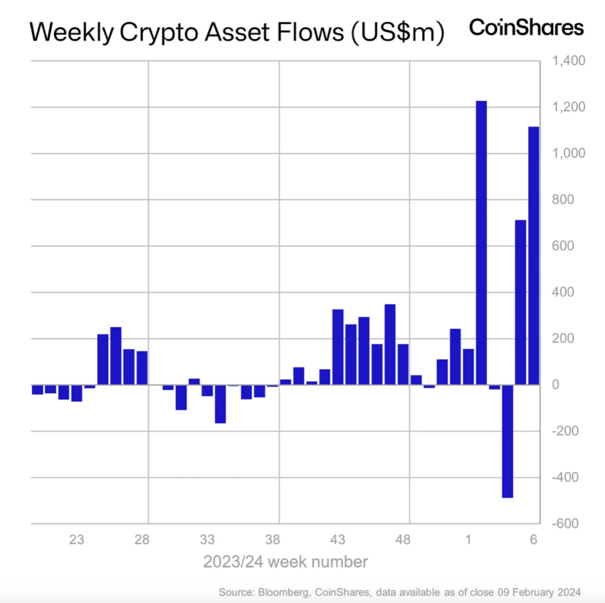 De acordo com um relatório recente, os produtos de criptomoedas experimentaram um influxo de US$ 1,1 bilhão na semana passada, impulsionado principalmente pelo Bitcoin (BTC), que respondeu por 98% do total de influxos. Ethereum (ETH) e Cardano também observaram um aumento na dinâmica durante o período de 7 dias.