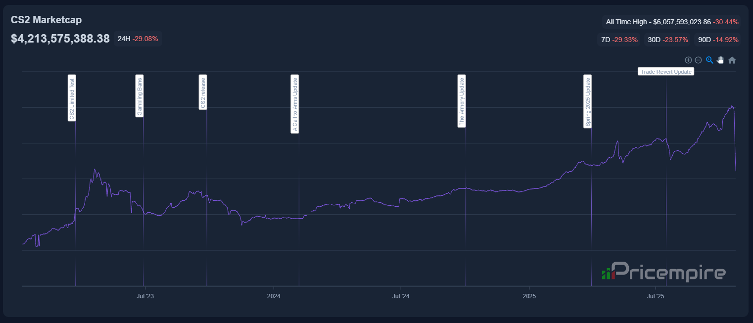 A queda, que chegou a US$ 1,72 bilhões, segundo a Pricempire, aconteceu devido à mudança que agora permite que jogadores troquem cinco itens com a segunda maior raridade no jogo por facas ou luvas, que são itens mais difíceis de obter.