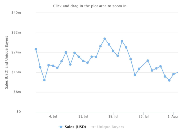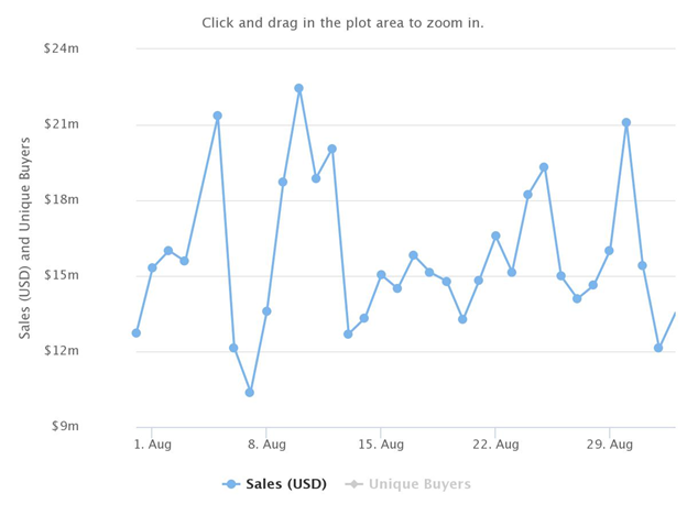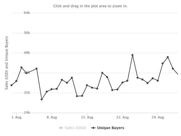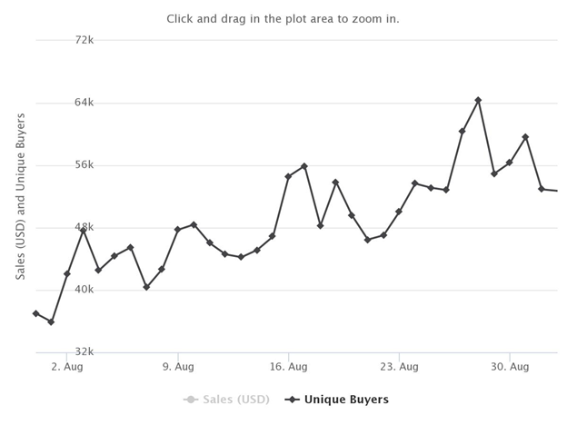 Os 495.666 compradores únicos de agosto de 2022 e o valor médio de venda de US$ 132,33 tiveram uma queda de 19% e 87%, respectivamente, em relação aos números do marco do ano passado.