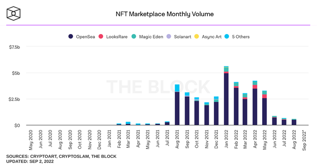 A estatística mais recente é um reflexo do sentimento negativo do mercado para colecionáveis digitais, que viu as plataformas NFT gerarem volumes totais abaixo de US$ 1 bilhão nos últimos três meses (junho a agosto). Os marketplaces atingiram um pico histórico de US$ 5,63 bilhões em janeiro.
