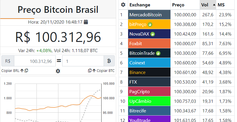O preço vem um mês após o rompimento do antigo recorde de R$ 70 mil. Segundo o Cointrader Monitor, a criptomoeda já é negociada em exchanges do país por R$ 100,3 antes das 17h. Em corretoras como a NovaDAX, o BTC já sai por mais de R$ 100,4 mil.