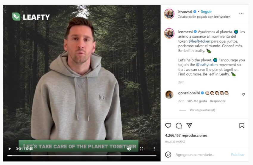 O astro do futebol Lionel Messi anunciou publicamente (embora tenha se juntado ao projeto no ano passado) em suas redes sociais seu apoio ao token sustentável Leafty, pedindo aos seus fãs para “cuidar do planeta” através do ativo, que é focado no plantio de árvores.