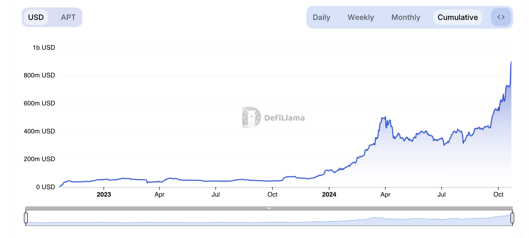 Esse crescimento, é evidente no setor próspero de finanças descentralizadas (DeFi) de Aptos. Nos últimos 30 dias, o valor total bloqueado (TVL) em DeFi aumentou 67% nos últimos 30 dias, alcançando um recorde de US$ 909 milhões.