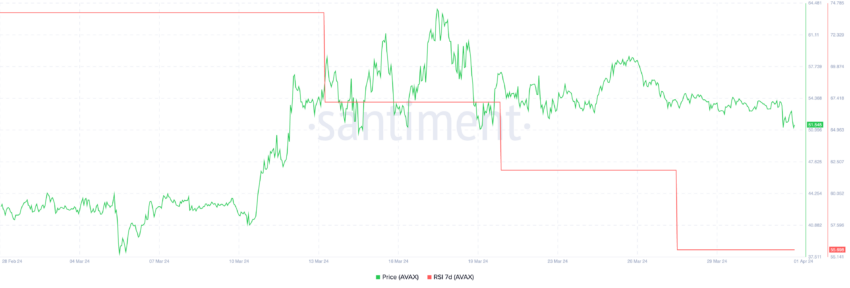 O RSI semanal da Avalanche tem caído consistentemente, sinalizando uma mudança no sentimento do mercado. Em 13 de março, o indicador estava em 74, mostrando um forte interesse dos compradores. Mas, caiu de 61 para 55 entre 27 e 28 de março e permaneceu lá. Isso indica um arrefecimento do entusiasmo dos investidores.