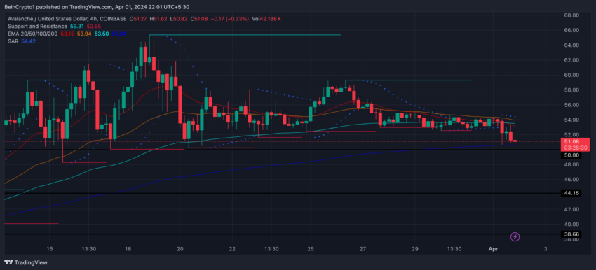 Entre 31 de março e 1º de abril, o AVAX passou por uma mudança significativa, pois sua métrica Stop and Reverse (SAR) passou de alta para baixa. A métrica é uma ferramenta de análise técnica projetada para identificar possíveis reversões na direção do mercado.