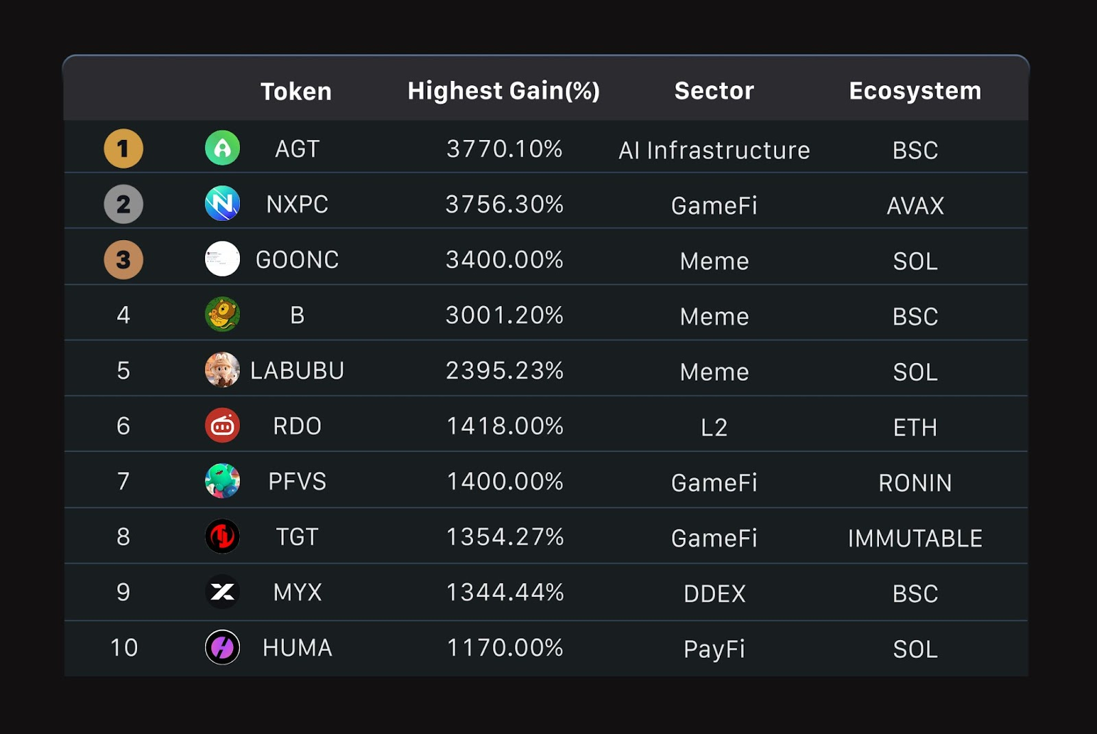 Alguns dos maiores ganhos vieram de setores que continuam a moldar o próximo ciclo de mercado. O token de infraestrutura de IA AGT teve valorização máxima de +3.770,10%, seguido pelo projeto de jogos blockchain NXPC (+3.756,30%) e o protocolo PayFi HUMA (+1.170,00%).