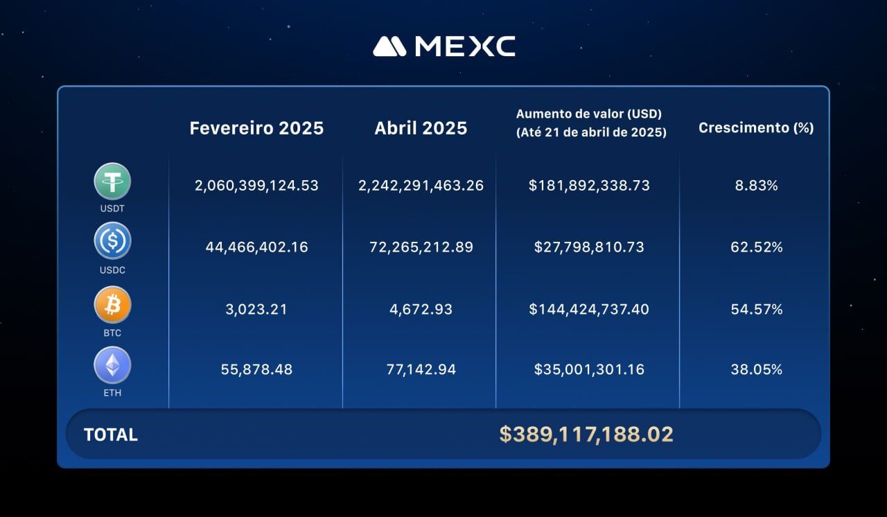 A comparação entre fevereiro e abril de 2025 revela um aumento expressivo nas reservas on-chain da MEXC, com crescimento total de aproximadamente 389,1 milhões de dólares: