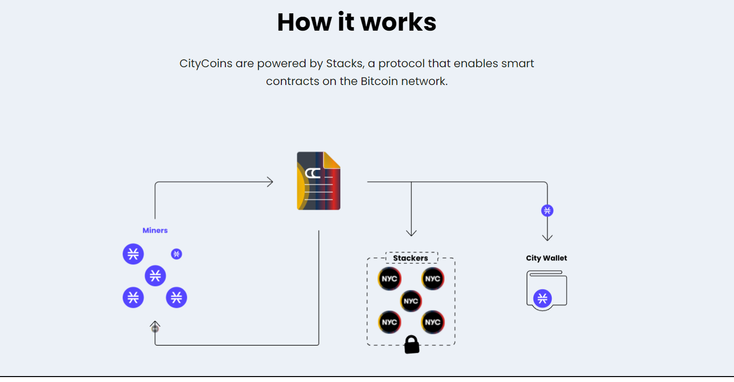 Primeiro, a comunidade minera para criar CityCoins. A mineração é realizada encaminhando tokens STX para o contrato inteligente em um determinado bloco Stacks e é um processo unidirecional. Os mineradores são recompensados com novos tokens CityCoins.